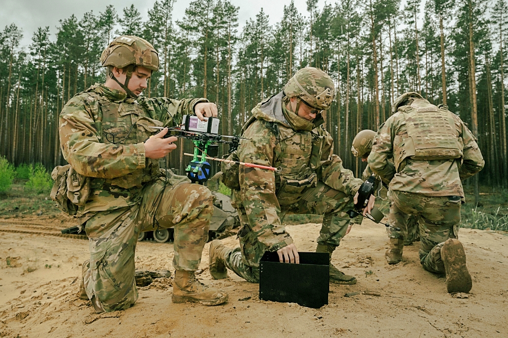 U.S. Army paratroopers assigned to the 173rd Airborne Brigade prepare to operate and detonate a live First Person View (FPV) drone at Pabradė Training Area, Lithuania, during a joint forcible entry operation as part of Swift Response 2025, May 18, 2025. (U.S. Army photo by Sgt. Jose Lora)