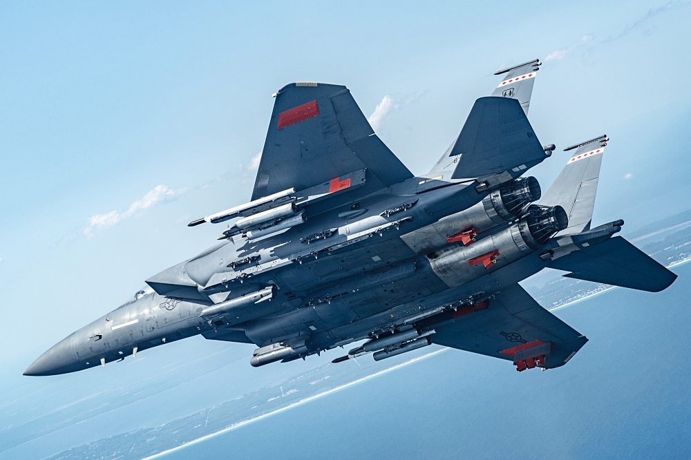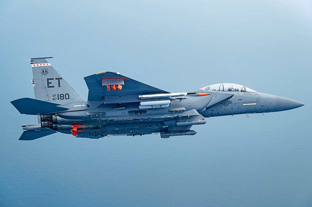A 96th Test Wing F-15E Strike Eagle flies during a test mission May 22, 2025 over Eglin Air Force Base, Florida – U.S. Air Force photo by Staff Sgt. Thomas Barley