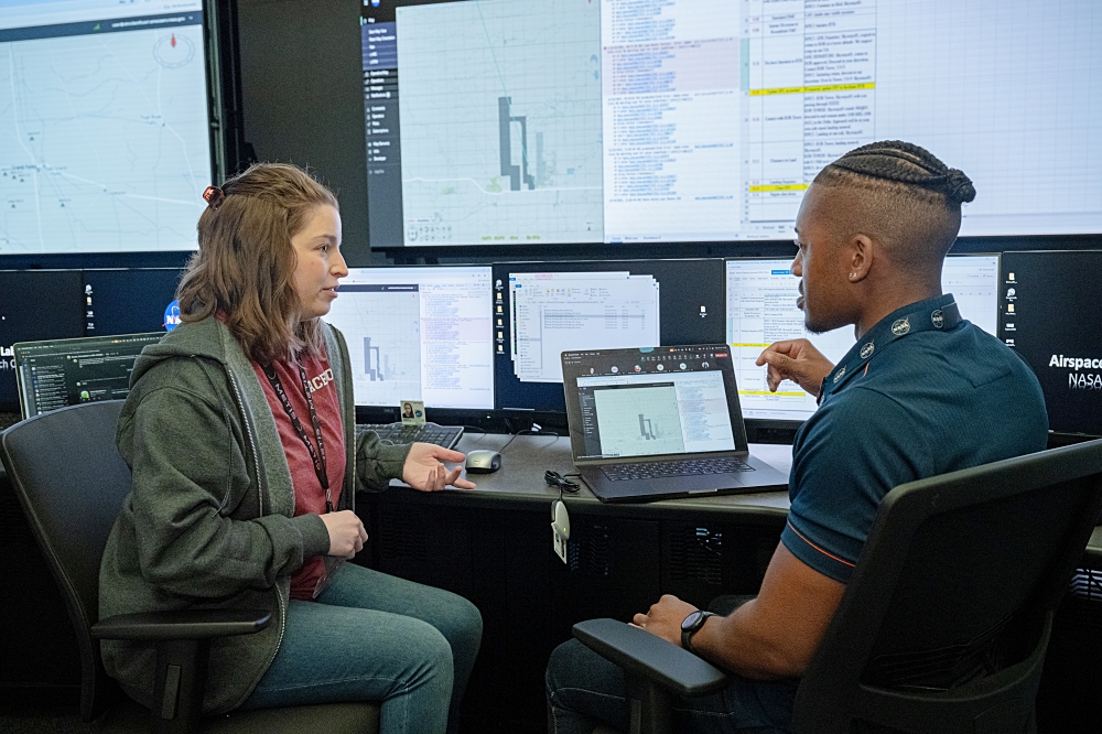 Sheryl Jurcak, left, and Terrence Lewis, right, oversee the managing software for the Federal Uncrewed Aircraft System Service Supplier Synthesis Effort (FUSE) live flight simulation at the Airspace Operation Lab (AOL) in N269.