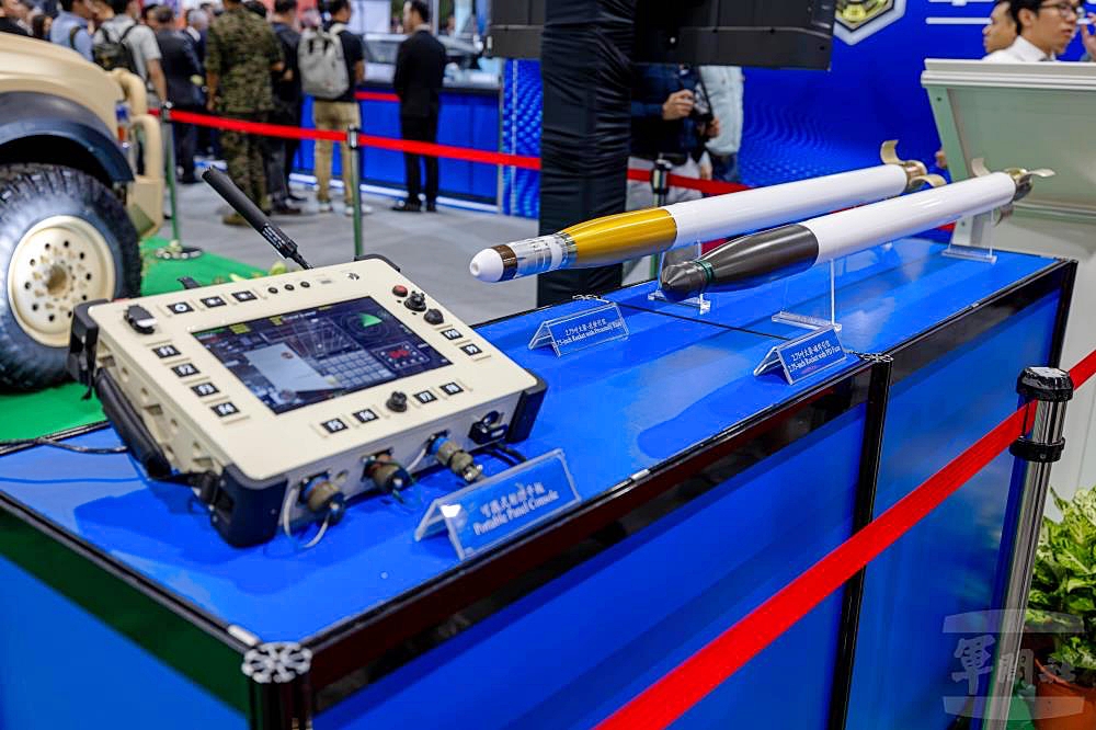 Control console and 70mm rocket munitions for Taiwan’s Rocket Turret Vehicle, displayed at the Taipei Aerospace & Defense Technology Exhibition 2025. Photo: Cai Fangyun/Military News Agency