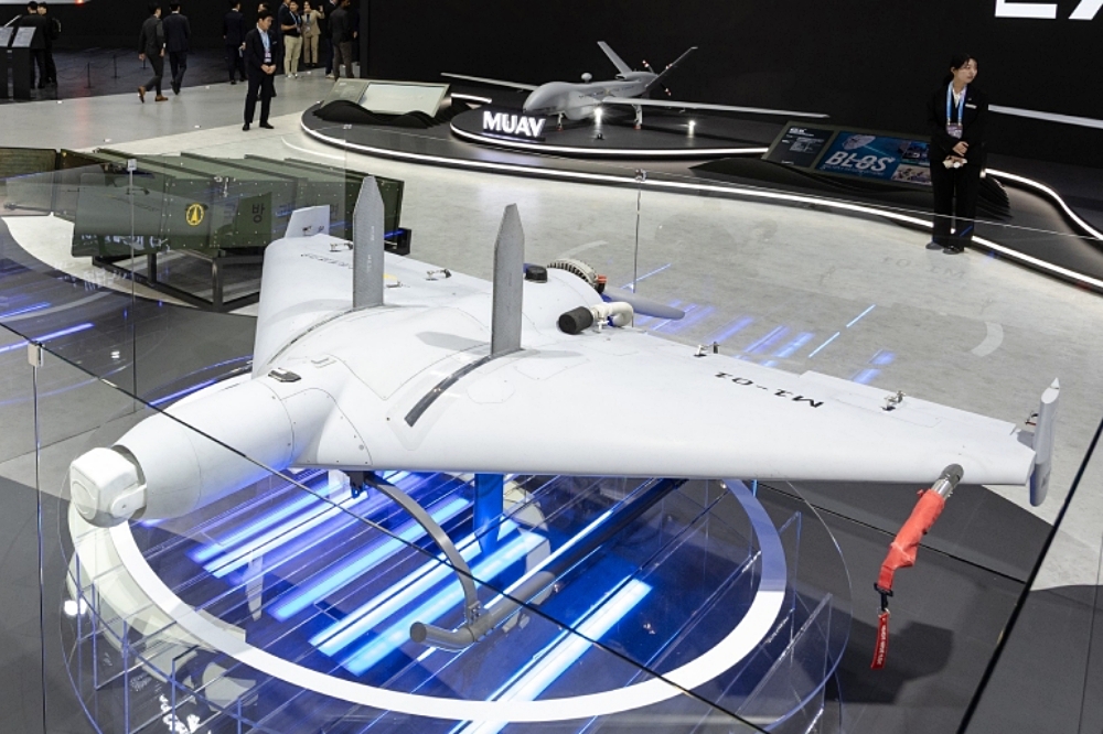 A medium strike UAV (Loitering Munition) prototype at Korean Air’s booth at Seoul ADEX 2025