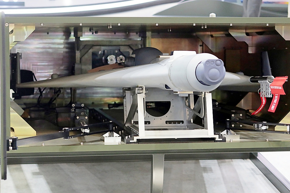 What are definitely offensive assets are the two delta-wing Loitering Munitions, also developed in cooperation with the ADD, both deployable from a single or multiple cell launcher installed for example on a vehicle. They are powered by a rear mounted internal combustion engine driving a two-blade pushing propeller. The fuselage is cylindrical wings are fitted with winglets at extremities, the optronic sensor package being installed at the front; no vertical tail surfaces are fitted, as these are contained in the wing thickness and rotate up and down once the airframe leaves the launch canister. The Small LM is 1.5 metres long, it has a 1.2 metres wingspan, has a take-off mass of 25 kg and carries a 2-3 kg warhead of unspecified type. The munition exploits an image-based terminal guidance to hit the target, static or moving, once this has been confirmed by the operator who can observe the scene thanks to the 50 km range data link, the 2.5 hours endurance allowing the munition to loiter over the scene and eventually be shifted on a different target. The Small LM can operate in swarms, in order to saturate enemy defences.
