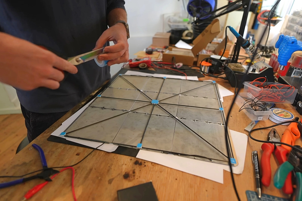 Some 27 very fragile panels – a couple broke during gentle testing, and more proved no match for the family cat – were connected in series, for a combined output of around 150 watts during ground tests. These were mounted to a support structure made up of 3-mm carbon fiber tubes, and the whole shebang bolted to the drone’s X-frame.
