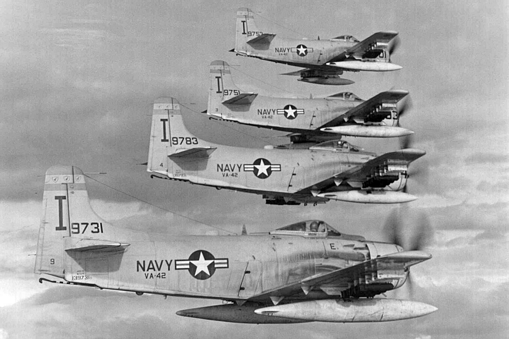 U.S. Navy Douglas AD-6 Skyraider aircraft (BuNo 139731, 139751, 139753, 139783) from Attack Squadron VA-42 Green Pawns in flight. VA-42 was assigned to Air Task Group 181 (ATG-181) from 1955 to 1957. The A-1H (AD-6) 139731 was later lost while in service with VA-152, Carrier Air Wing 16 (CVW-16) , USS Oriskany (CVA-34), on 14 October 1966. The aircraft was flown by Ens. Thomas on a night road reconnaissance mission 40 km southwest of Thanh Hoa, North Vietnam. When his section spotted trucks on a road, Thomas dove to attack the target with rockets. However, he failed to pull out of the dive and was killed when his aircraft struck the ground.