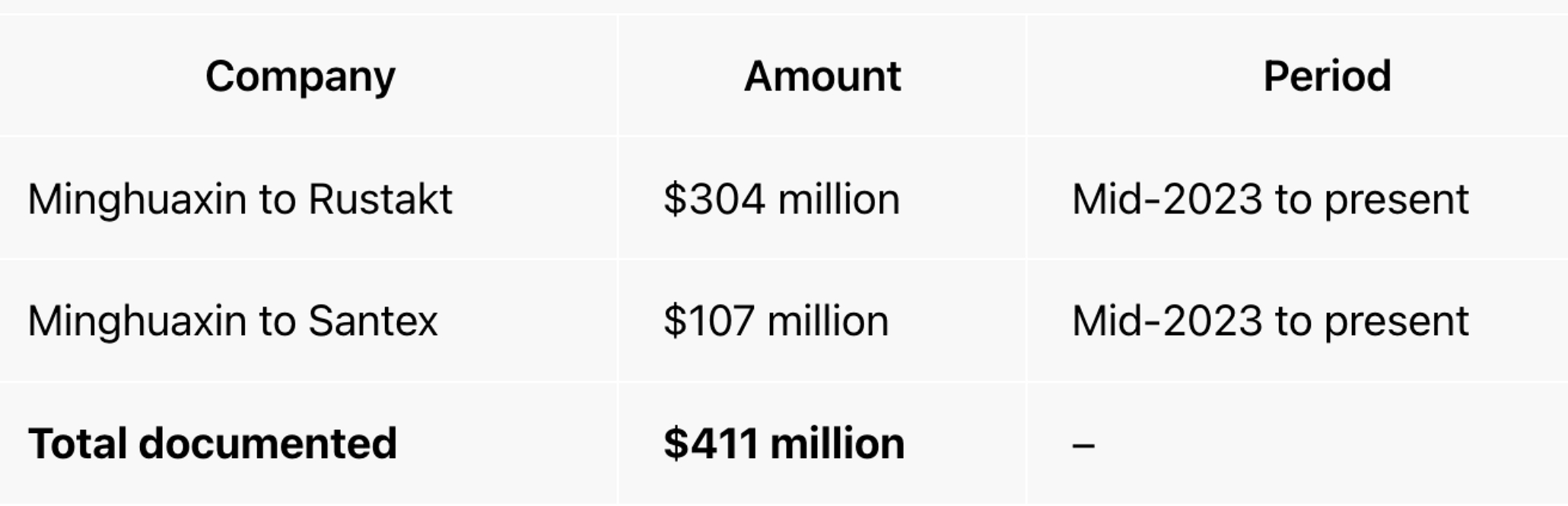 The breakdown is equally revealing. According to customs records analyzed by the FT, Rustakt purchased $110 million in lithium-ion batteries, $87 million in motors, and $64 million in controllers from Minghuaxin since mid-2023.