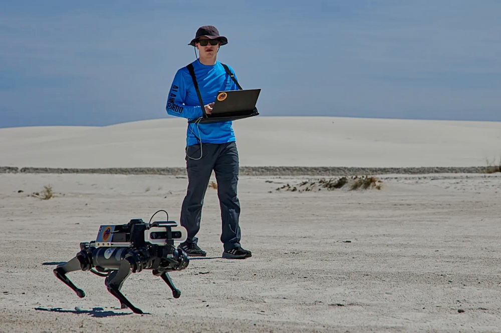 A researcher monitors LASSIE-M ( (Legged Autonomous Surface Science In Analogue Environments for Mars) at Mexico’s White Sands National Park