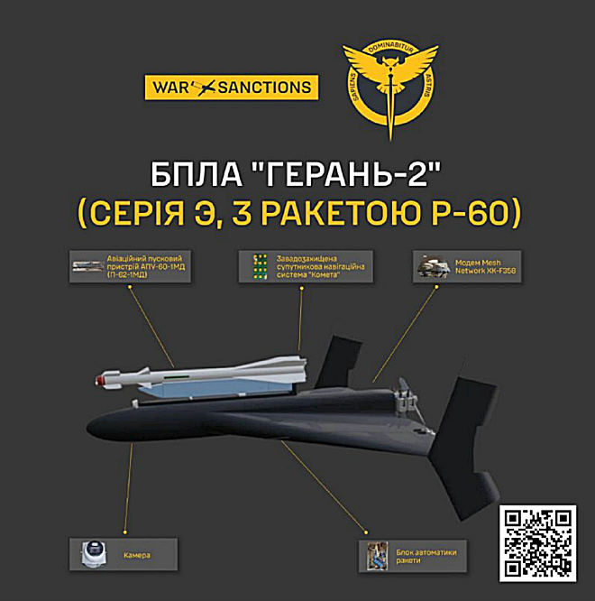 In a report published on its War&Sanctions portal, HUR said Russia has equipped a modified Geran-2 drone with an R-60 air-to-air missile, originally designed for use by combat aircraft.