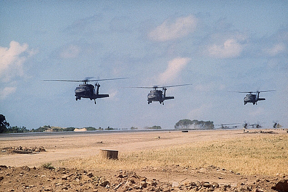 Three U.S. Army Sikorsky UH-60A Black Hawk helicopters prepare to touch down next to the Point Salines airport runway during “Operation Urgent Fury” on 25 October 1983