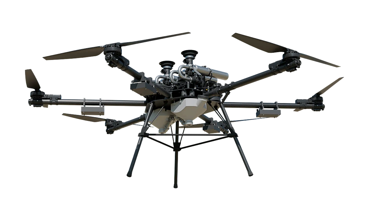 Designed for endurance and payload flexibility, the HD-606 can carry 50 kg for 30 minutes or 25 kg for more than three hours. With a top speed of 20 m/s (72 km/h), it supports armed overwatch, anti-vehicle interdiction, and high-value asset protection. Its 48 V architecture uses six motors and dual generators delivering 14,000 W for redundancy, supplemented by a 10 Ah battery for limited standalone flight.