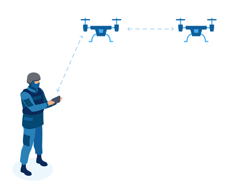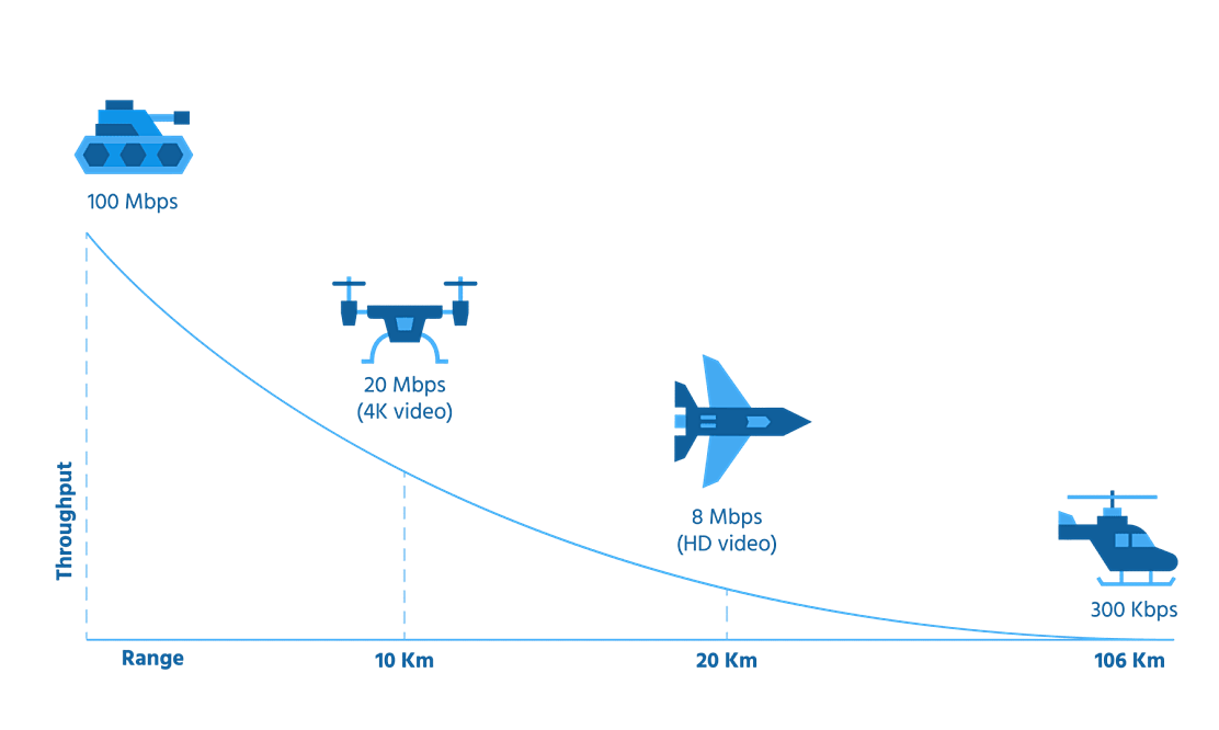 The Smart Radio mesh network provides multi-hop relay capability for C4ISR (Command, Control, Communications, Computers, Intelligence, Surveillance, and Reconnaissance) operations over extended ranges. Data-aware PHY and MAC layers deliver highly reliable, low-latency URLLC performance for sensitive command-and-control traffic while maintaining high-quality 4K and HD video transmission. Distance-based Automatic Transmit Power Control (ATPC) optimizes power usage, conserving battery life and extending mission duration.