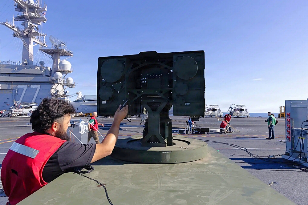 A member of the joint U.S. Navy, U.S. Army, and AeroVironment, Inc. team makes adjustments to the containerized LOCUST Laser Weapon System (LWS) on the flight deck of the Nimitz-class aircraft carrier, USS George H.W. Bush (CVN 77), for a live-fire test. During the live-fire event, LOCUST LWS effectively detected, tracked, engaged, and neutralized multiple unmanned aerial vehicles marking a milestone toward fielding operational directed energy capabilities. (Photo courtesy U.S. Navy)