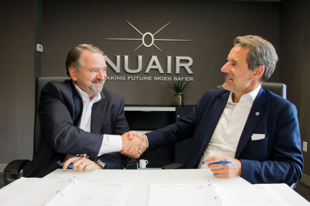 Major General Marke F. “Hoot” Gibson (ret), chief executive officer of the NUAIR Alliance (left) signs partnership agreement with Marc Kegelaers, CEO of Unifly (right)